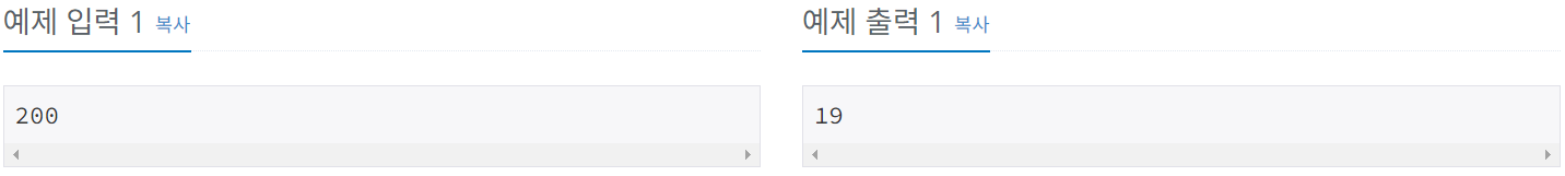 - 만약 합이 입력 받은 s보다 커질 경우를 확인해야 한다. (작은 경우를 확인할 경우, 만약 191이 입력될 경우 출력은 19가 아닌 20이 n이 되기 때문이다.