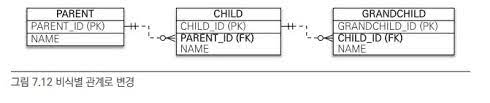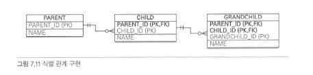 - 식별 관계에서 자식 테이블은 부모 테이블의 기본 키를 포함해서 복합 키를 구성해야 한다.