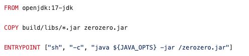 - COPY : 호스트 시스템의 로컬 파일을 Docker 이미지 내부로 복사합니다. 빌드되어 생긴 jar 파일을 Docker 이미지 내부의 /zerozero.jar 로 복사합니다. 즉, Java 어플리케이션의 실행 파일이 위치한 곳을 Docker 이미지 내부로 복사하는 역할을 합니다.