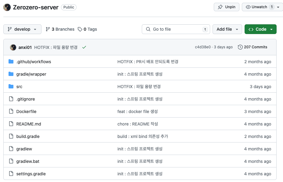 설정 후 develop 브랜치에 Push를 하게 되면 위와 같이 workflow가 실행됩니다.
