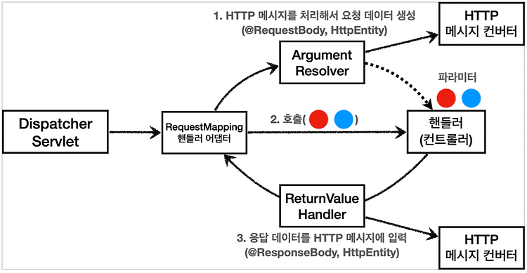2. Handler Adapter은 ArgumentResolver를 호출하여 요청을 핸들러(컨트롤러)에 전달한다. 이때 Argument Resolver에서 HttpMessageConverter를 사용하여 요청(json)을 객체(dto)로 만든다. <역직렬화>