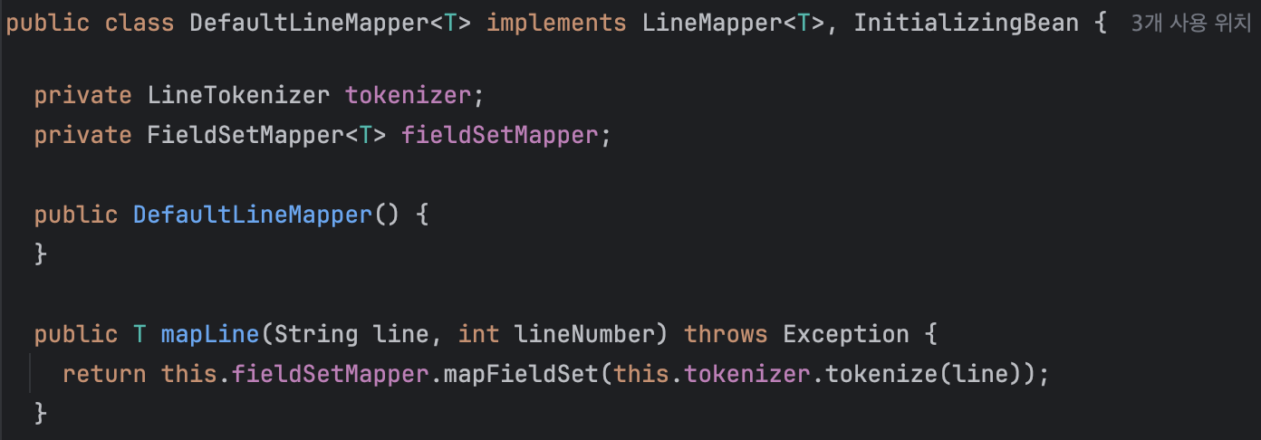 - LineMapper : flat file에서 각 행을 읽어 객체로 매핑해주는 인터페이스다.