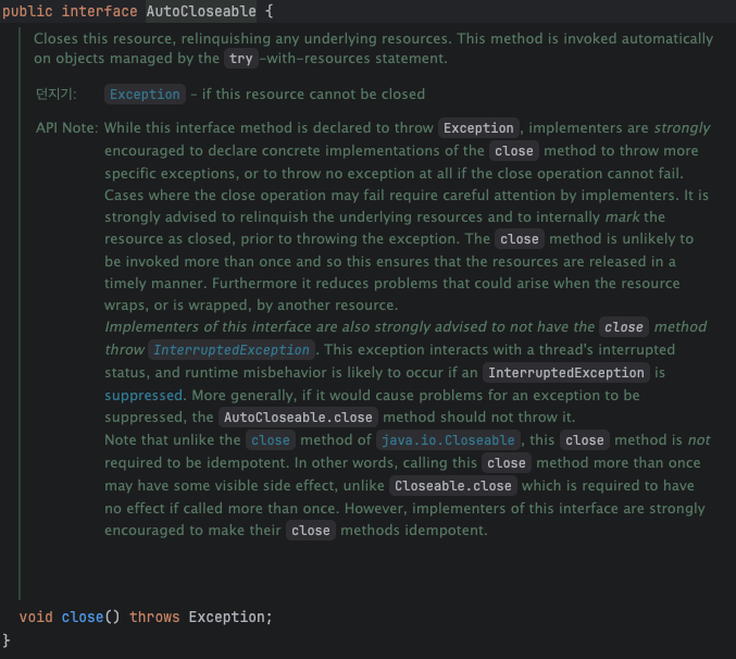따라서 자바 7 이상이고 AutoCloseable를 구현할 수 있다면 try-with-resources를 사용하길 바란다.