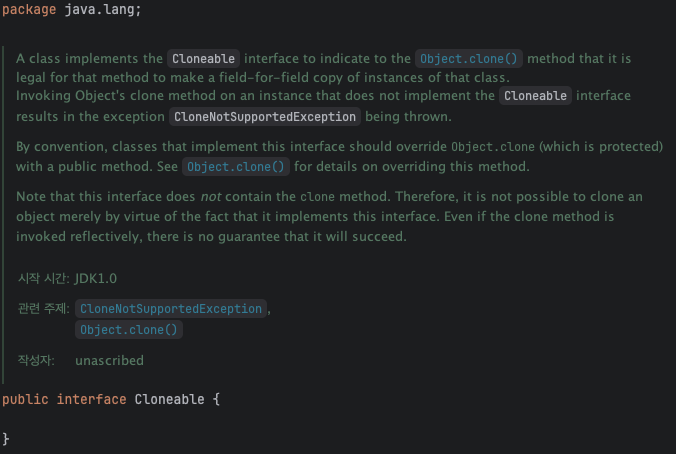 Cloneable : 복제해도 되는 클래스임을 명시하는 용도의 인터페이스