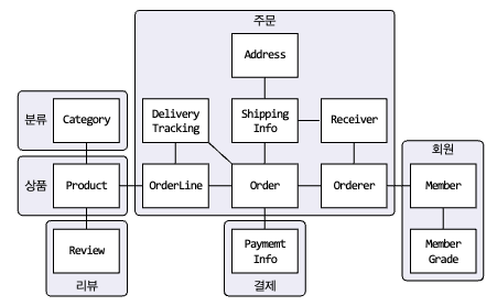 - 주문할 상품 개수, 배송자 정보, 주문자 정보는 주문 시점에 함께 생성되기 때문에 한 애그리거트에 속한다.