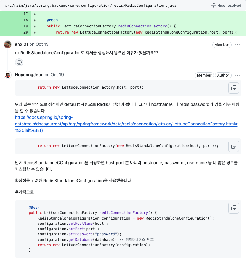 백엔드 같은 팀에서 함께한 호영이 형은 이전에 자바/스프링이 아닌 Node로 개발을 했었습니다. 처음에는 부족한 제가 형에게 코드 리뷰를 하면서 변경을 요구할 수 있을지 고민이 많이 들었지만, 호영이 형이 코드 리뷰를 해주는 것이 너무 좋고, 고맙다고 말하며 자신에게 도움이 많이 된다고 말해주어서, 진심을 담아 코드 리뷰를 하게 되었습니다.