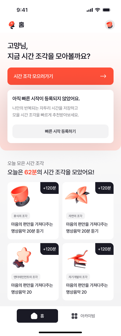 ‘조각조각’은 일상 속에서 발생하는 자투리 시간을 의미 있게 활용할 수 있도록 돕는 개인 맞춤형 활동 추천 서비스입니다.