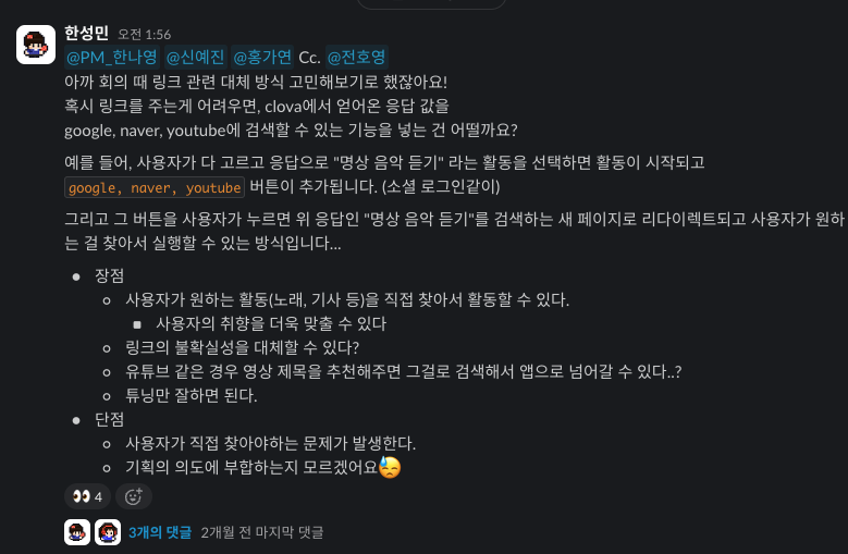 예전에 기획 파트인 나영, 가연, 예진 누나랑 백엔드 파트인 호영이 형이랑 새벽에 얘기하면서, 진지한 대화(진담)를 한 적이 있다.