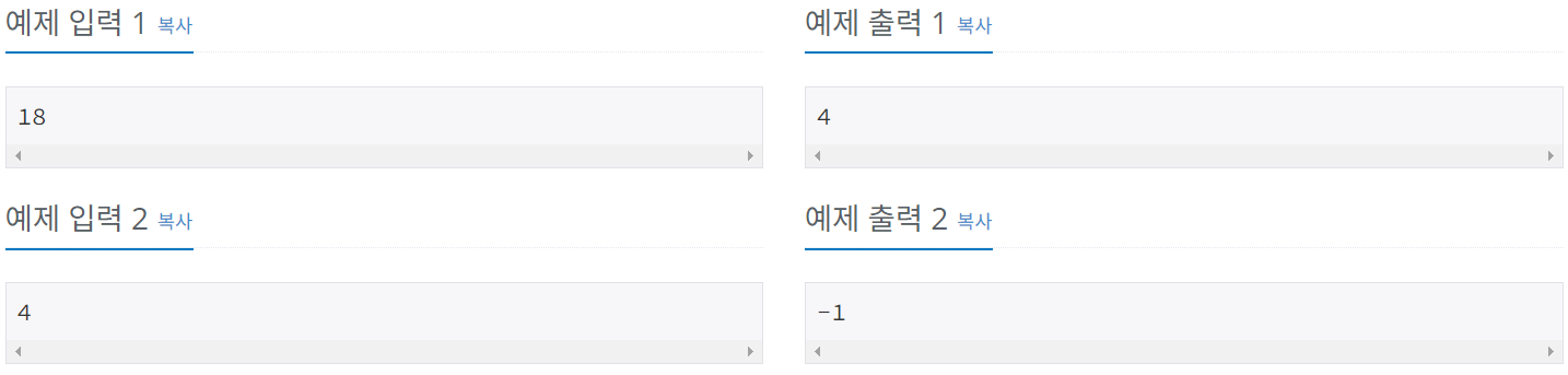 상근이가 배달하는 봉지의 최소 개수를 출력한다. 만약, 정확하게 N킬로그램을 만들 수 없다면 -1을 출력한다.