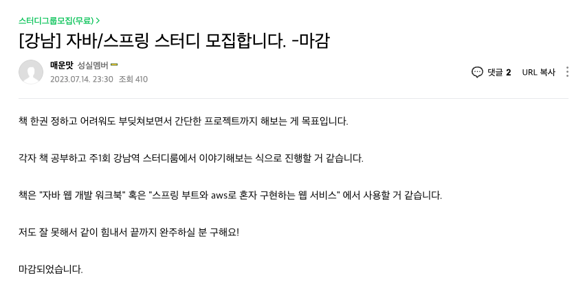 그러고 나서 개발을 열심히 잘 해지고 싶어서 정보를 찾던 도중 스터디를 해보라는 정보를 봤다. 그래서 자바, 스프링 경험이 거의 없지만 스터디 모집글을 작성했다.
