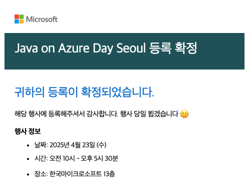컨퍼런스, 세미나를 많이 참여하는 게 좋다고 격려하시면서 AI 관련 세미나를 말씀해 주실 때 Microsoft에서 개최한 "Java on Azure Day Seoul 2025"도 알려주셨다. 이걸 보자마자 나는 스캇 티켓팅보다 기민하게 바로 신청했다 😂