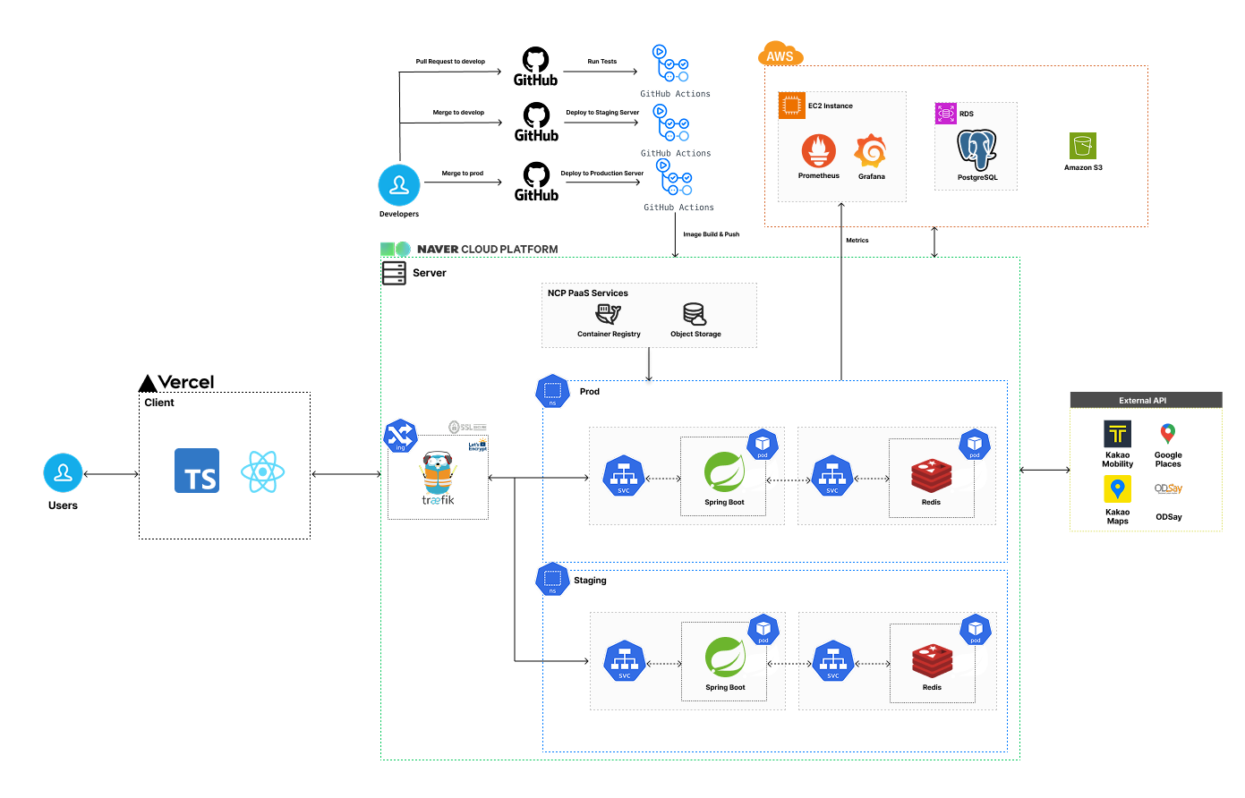 기존 아키텍처와 바뀐 부분은 쿠버네티스를 적용해서 Ingress 및 운영, 스테이징 네임서버 분리 그리고 스프링 애플리케이션 파드와 레디스 파드를 추가하였다.