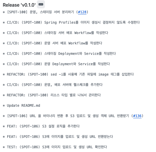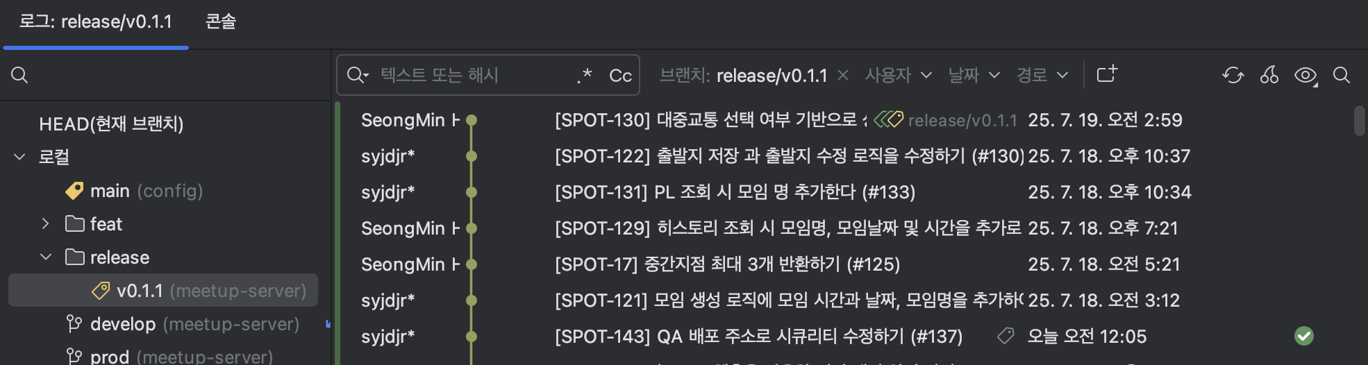 'SPOT-143'의 커밋을 보면 태그가 붙어 있습니다. 만약 prod 브랜치를 처음 만들었다면, 태그가 아닌 prod 태그가 붙어 있을 거예요!