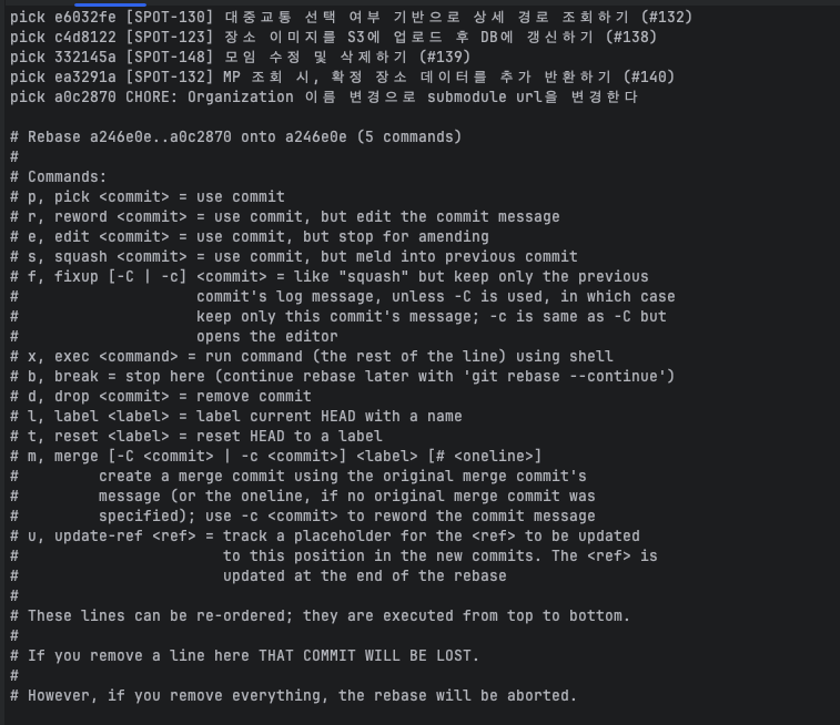 이렇게 해서 살릴 커밋만 남겼다면 :wq를 통해 vi 화면에서 나오면 됩니다.