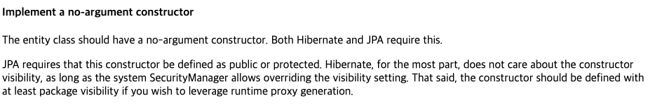 프록시가 필요 없는 경우인 컬렉션 연관관계에서는 내장 컬렉션을 프록시 대신 사용하므로 private 기본 생성자라도 문제가 발생하지 않음을 알 수 있다.