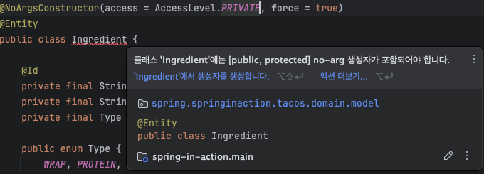 - Ingredient 엔티티의 기본 생성자는 private으로 되어 있다.