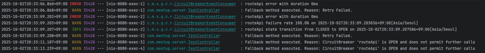 앞선 문제가 발생한 곳에선 Circuit Breaker가 먼저 수행됐기에 Retry가 동작하지 않은 것이다.