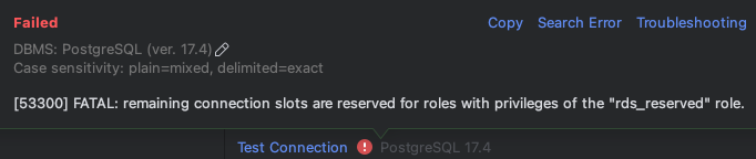 [PostgreSQL] FATAL: remaining connection slots are reserved for roles with privileges of the "rds_reserved" role 해결하기 본문