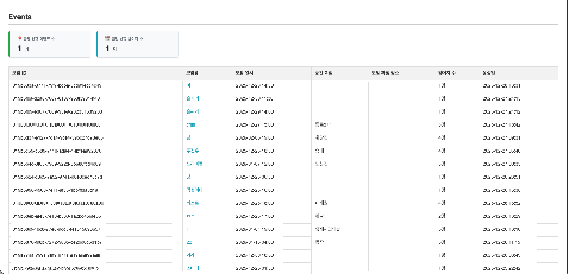 위의 과정을 토대로 사용자의 유입은 꾸준히 성장했다. 현수, 현비는 GA를, 나는 DB로 생성된 모임과 참여자 수 등을 확인했다. 그러나 GA에서 UTM으로 가져온 데이터를 확인하는 건 꽤 복잡했다. 그래서 나는 어드민 페이지를 만들어 현수, 현비도 모임 정보를 쉽게 확인할 수 있도록 했다.