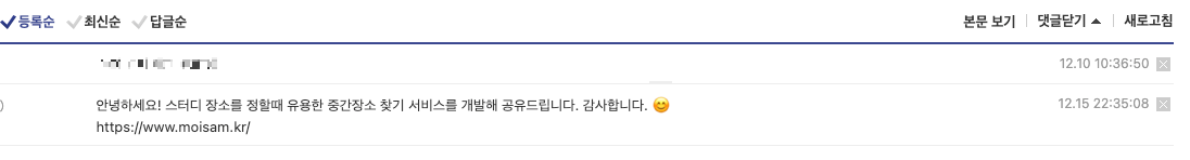 모이삼은 중간지점 찾기 서비스인 만큼, 동네 친구들 보단 거리의 편차가 큰 사용자들이 사용하기 적합하다. 그래서 대학생이 타겟층인데 에브리타임에 홍보를 한 적이 없었다. 그래서 12월 연말인 만큼, 모임이 많을 거라 판단하여 에브리타임에 글을 올렸다.