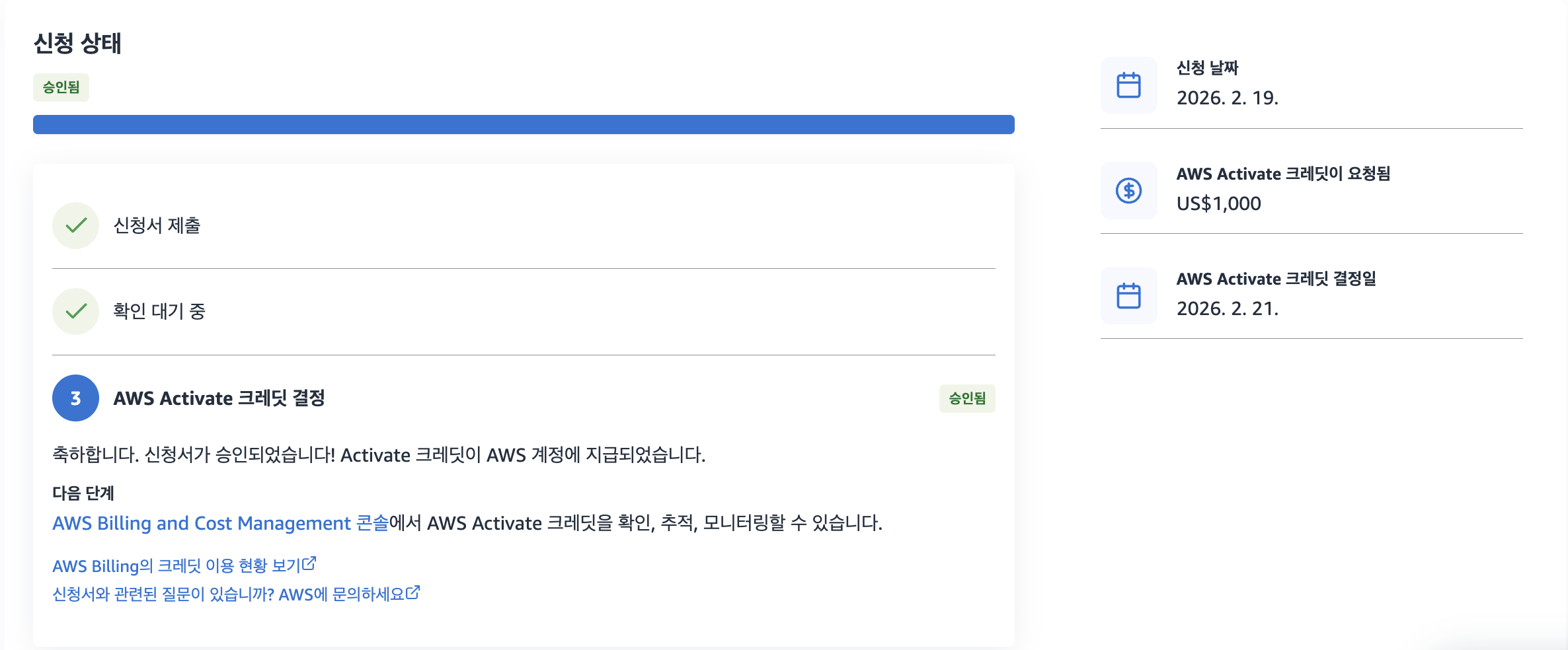 신청이 완료되면 회사 이메일로 확인 메일이 발송되며, AWS Startups 홈페이지에서도 상태를 확인할 수 있다. (페이지 내 '신청서 제출' 항목에 체크 표시가 되어 있다.)