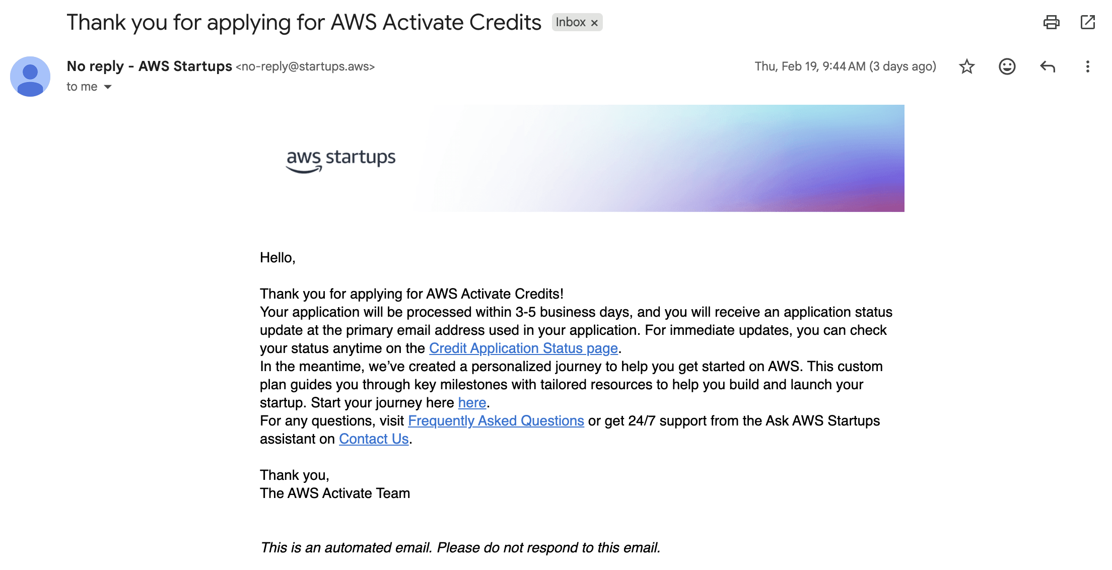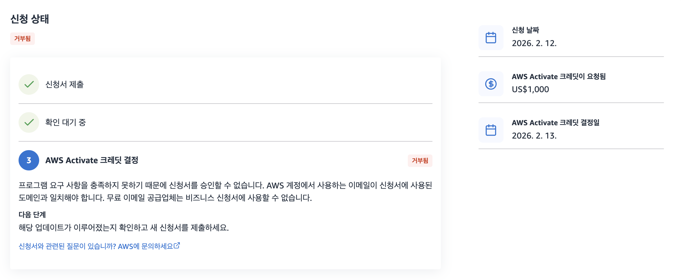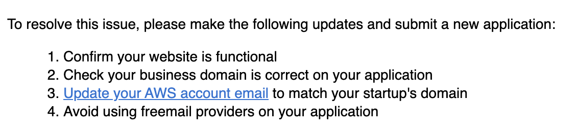 그래서 나는 AWS Startups 문의를 통해 우리의 상황이 자격 요건을 충족함을 나타냈고, 어떤 이유로 반려되었는지를 문의했다.