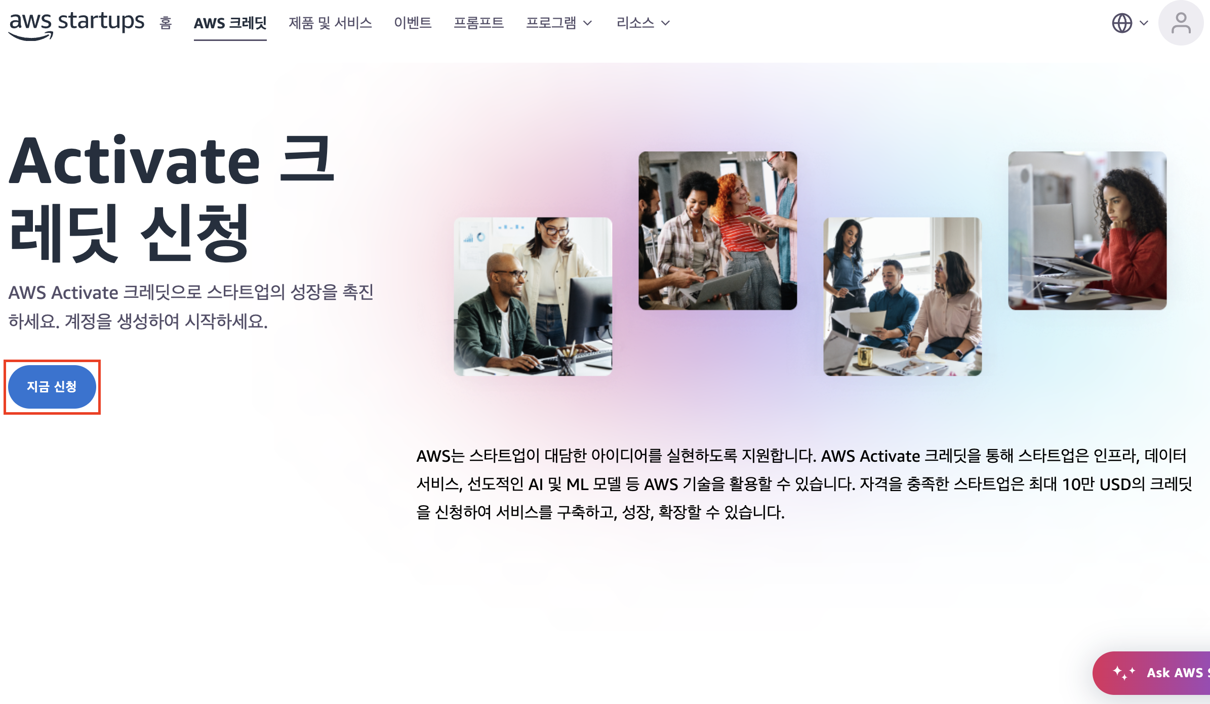 로그인 후, AWS 크레딧 탭에 진입 > "지금 신청" 클릭한다.