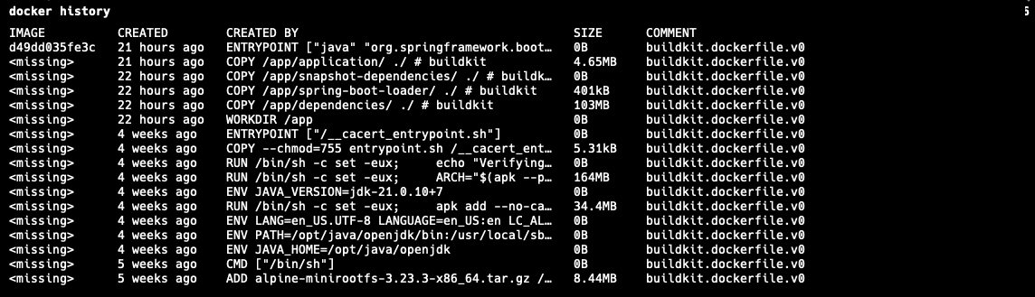 - builder 스테이지: `java -Djarmode=layertools -jar` 명령어로 JAR에서 레이어를 추출(extract)하는 과정.