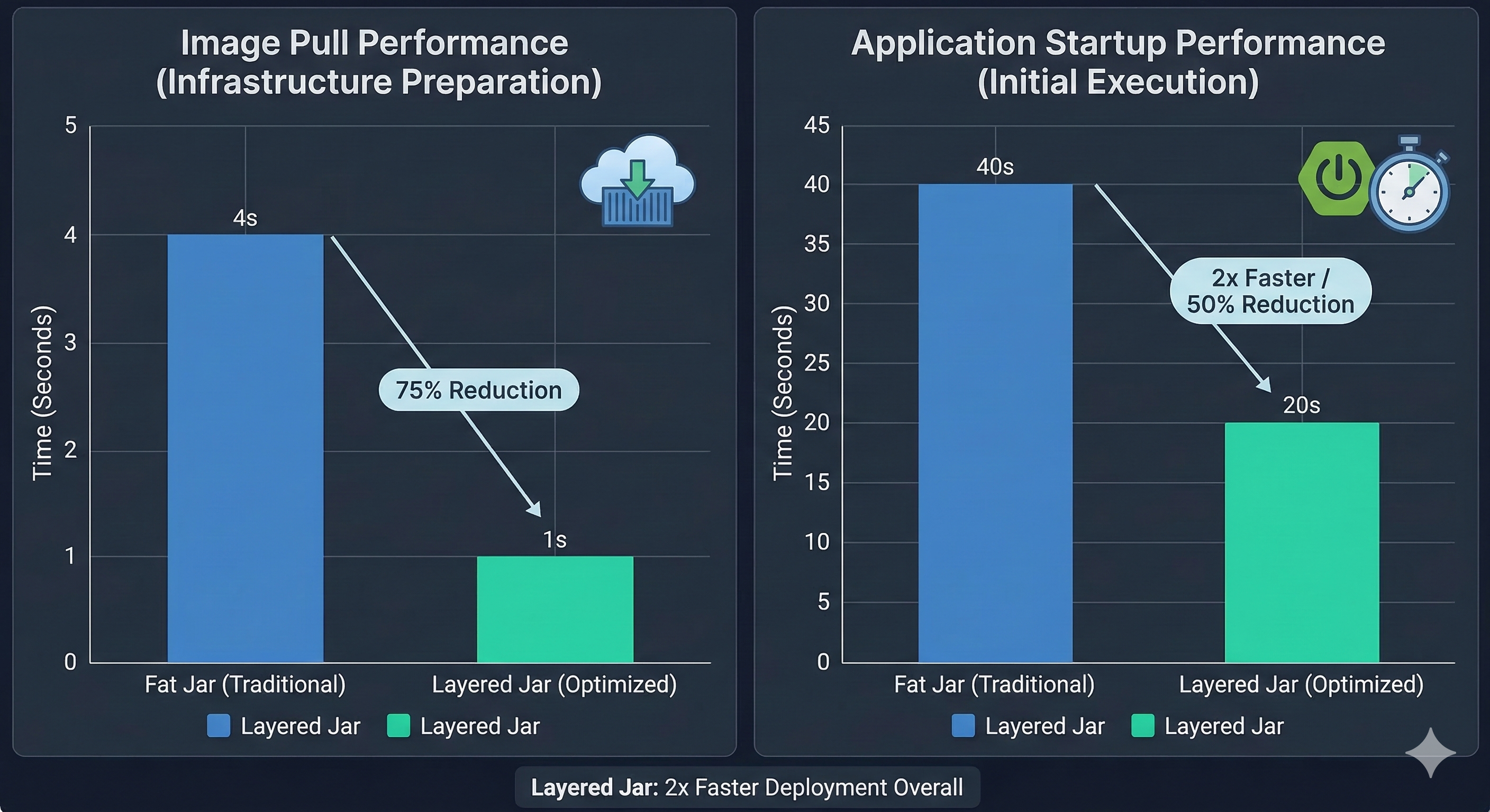 - 해석: 기존 Jar 방식의 40초에 비해, Layered Jar 방식은 20초로 단축되었다. 기존 Jar 방식은 압축이 되어 있어 압축 해제하고 클래스 로딩하는데 시간이 소요되지만, Layered Jar 방식은 DockerFile에서 extract로 압축을 풀었기 때문에 곧장 클래스 로딩을 하여 시간이 단축된 것으로 확인된다.